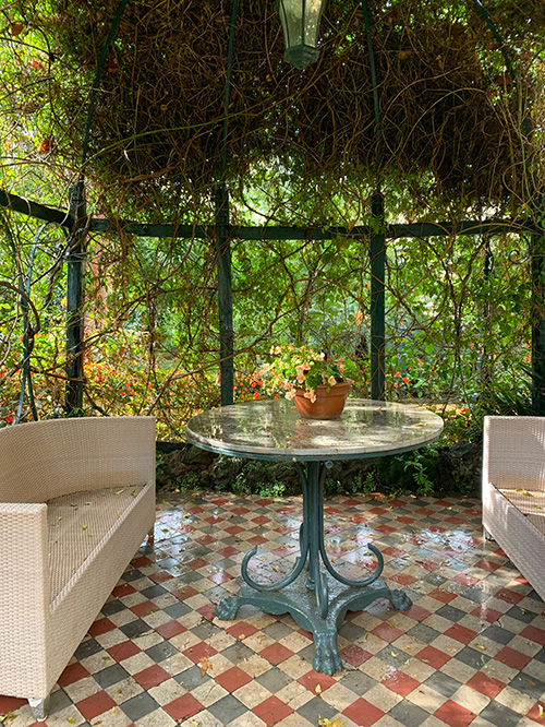 The card’s setting derives from photographs I took in Sorrento, Italy. The tiled floor and the backdrop of orange trees felt fitting, since I conceived The Magus as a kind of street performer—someone whose skills are exercised in public, in the everyday world rather than on a grand stage. An outdoor setting suited that interpretation, while paying homage to the Tarot’s Italian origin.